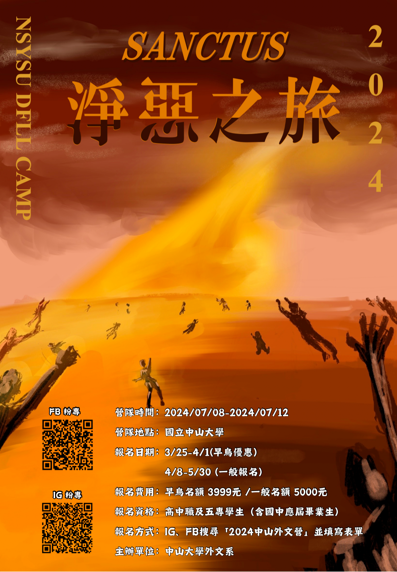 (六)FB粉絲專頁(2024中山外文營):https://www.facebook. com/profile.php?id=61556837051726;IG專頁 (Sanctus.2024):https://www.instagram.com /sanctus.2024?igsh=dGdlenRmcnM5OXZ2
