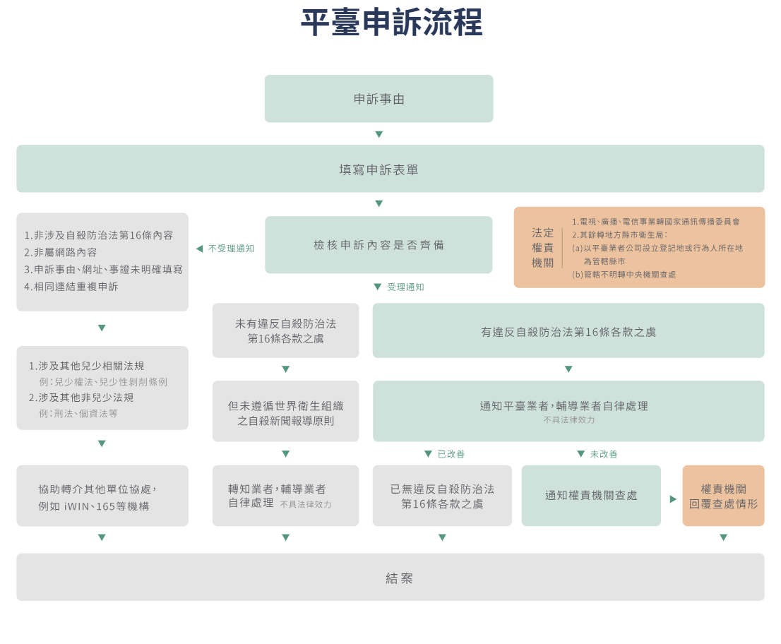 (五) 申訴處理機制:將依自殺防治法及世界衛生組織自殺新聞報導原則,檢視網路媒體不當自殺內容,並通知前揭業者予以自律處理,並於申訴受理後7個工作天內回復處理情形(申訴流程圖詳如附件)。